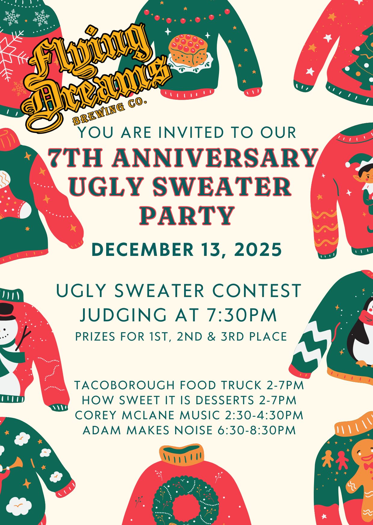 Ugly Sweater Contest Judging at 7:30pm with prizes from 1st, 2nd & 3rd place